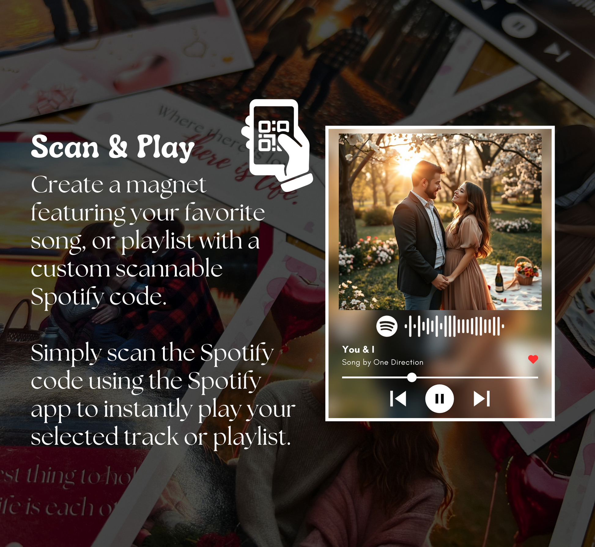 Turn your favorite memories into a unique, interactive keepsake with our Spotify Photo Magnets! Simply scan the Spotify code on your magnet to instantly play your special song or playlist.